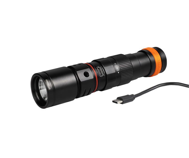- The OrcaTorch DC710 is a dive light specifically designed for underwater use. It features a USB Type-C direct charging function, making it convenient for users to recharge. It utilizes a Luminus LED with a maximum brightness of up to 3000 lumens. The DC710 is powered by a single 21700 5000mAh lithium-ion battery, ensuring reliable power support. With a beam angle of 6 degrees, the DC710 is capable of delivering an extremely focused beam for spotlighting. It is equipped with a titanium alloy side button switch for easy operation and also includes a safety lockout function to prevent accidental operation. It can function normally in water depths of up to 150 meters, offering a reliable lighting solution for divers.